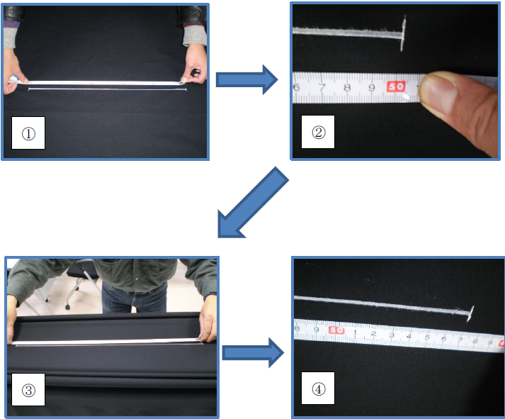 50cm のラインが 57cm になりました。結果、+14%の伸度があるということになります。ポリエステル 100% の生地でもこれだけのストレッチ性があれば、動きやすいビジネススーツやワーキングウェアを作ることができます。前述のゴルフスラックスでストレッチ織物の需要が高まったのは、伸度と同時に軽くてシルエット性のよい生地が求められたからであり、ニットスラックスの問題点であった膝抜け(ひざぬけ)を解消することができたからだと考えられています。膝抜けとは、繰り返し着用しているうちに膝の部分がふくれあがる現象のことです。