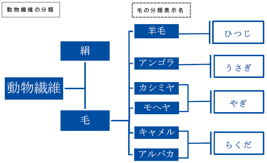 動物繊維で家庭用品品質表示法の指定用語で定められているのは“毛”と“絹”になります。以前はこれだけだったのですが、現在では“毛”の分類表示も認められています。認められている“毛”は、羊毛・アンゴラ・カシミヤ・モヘヤ・キャメル・アルパカの6種類、でその他の動物は“毛”となります。羊毛は字の通り ひつじ で、アンゴラは うさぎ、カシミヤとモヘヤは やぎ、キャメルとアルパカは らくだ の種類になります。テレビコマーシャルでお馴染みのアルパカは らくだの仲間なのです。