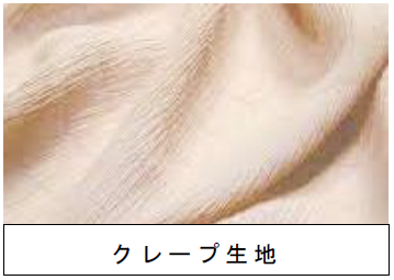 シボのある生地は他にもありますが、代表的なものはクレープと呼ばれる生地です。こちらのシボは経糸にほとんど撚りをかけていない甘撚りの糸を使い緯糸(よこいと)に強い撚りをかけた強撚糸(きょうねんし)を使い、精錬や染色によって生地が縮むことでシボを出しています。クレープは強撚糸を使うのが特徴になります。日本でも古くから作られている織物で、こちらは縮緬(ちりめん)と呼ばれています。もとは絹織物として作られていましたが、現在では綿や合繊でも商品化されています。