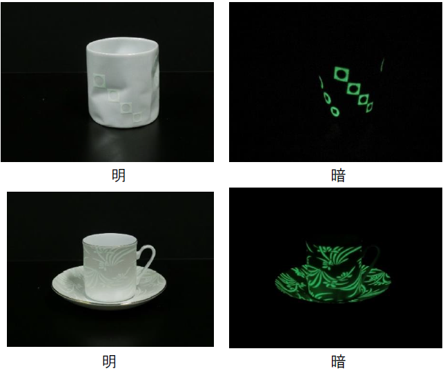 画像の商品は出来上がった製品に蓄光の絵付けをしたもので、筆者が協力したのは蓄光輝度性能をあげることと通常時の色ができるだけアイボリー系にしたいということの開発でした。いわゆる蓄光の気配を感じさせないでよく光るものをつくりたいという要望に応えた商品です。