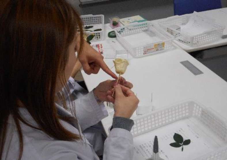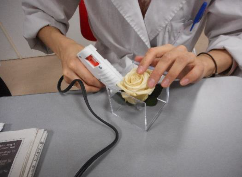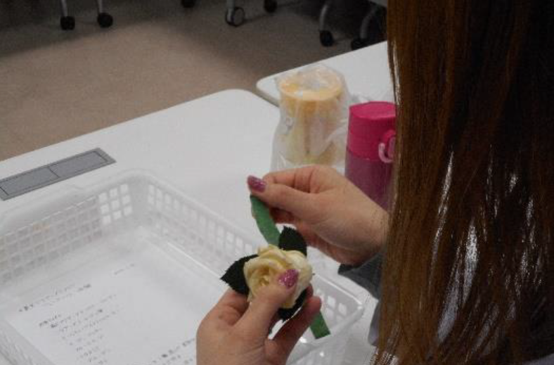 今回初めてプリザーブドフラワーを触った人もいたので、ちょっと説明を加えておきますと、生花を脱水作用のある液体に浸して水分を抜いたものに保存液となる液体に浸して乾燥させてつくるのですが、従来のドライフラワーとは違い、質感をもったドライフラワーを造ることができます。
