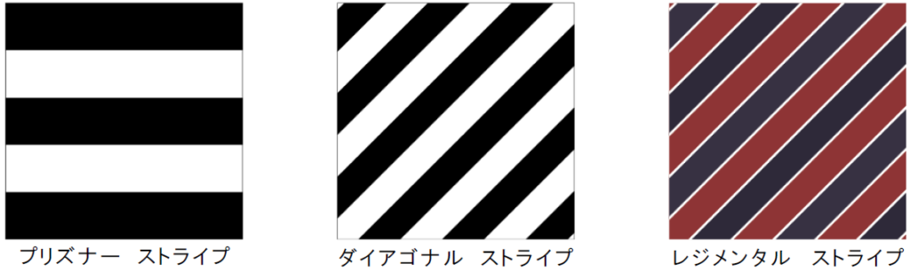 “ストライプ” の本来の意味は「隣接する部分と異なる色の長くて細い色の線のこと」となっており、たて・ よこ・ななめであってもすべてストライプになります。