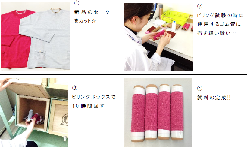 まず、新品の製品に人工的に毛玉をつけ、比較するための生地を作ります。