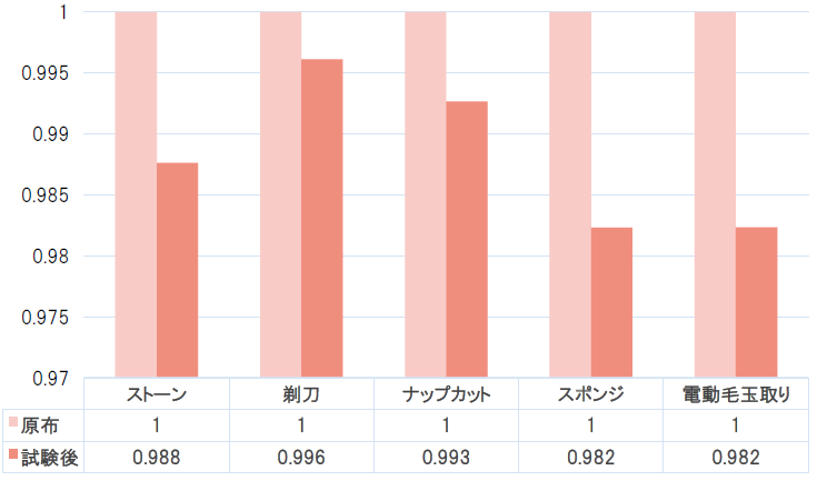 表1をみてもらうとわかる通り、ピリングストーンは10回削っただけでピリングをきれいにすることができました。同じく電動の毛玉取り器も10回できれいにすることができ、見た目もきれいに仕上がったのですが、表2を見るとピリングを削った後の生地の重さがかなり減ってしまっているのがわかると思います。