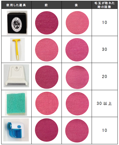 検証前後の生地の見た目と毛玉が取れた時の回数