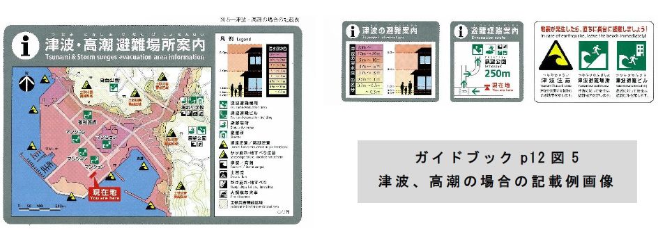 ② 避難場所等の案内板等の整備及び更新の際は、災害種別記号を使い、標識システムの表示方法に倣い、表示すること。