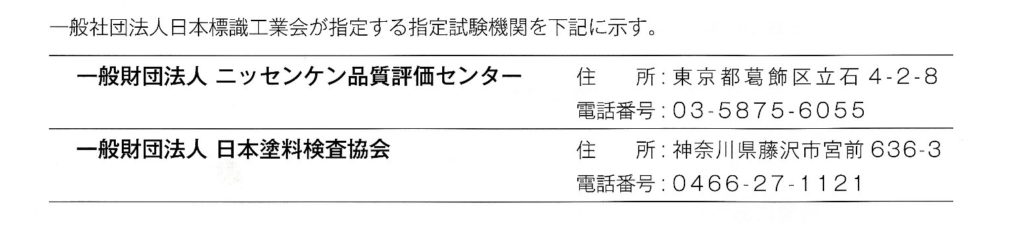 蓄光性能や反射性能の基準値や試験方法も掲載されています。蓄光性能は 720 分( 12 時間) 後も光っていなければならないと定められています。蓄光材料が屋外でも高い性能が要求されています。最後に宣伝させてもらいますが、これらの標識材料の試験に関しては検査機関が指定されています。