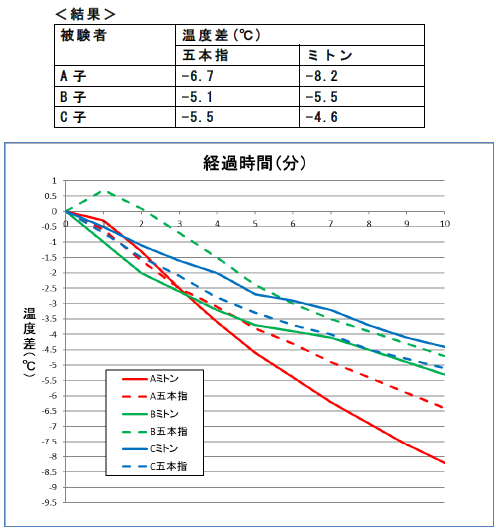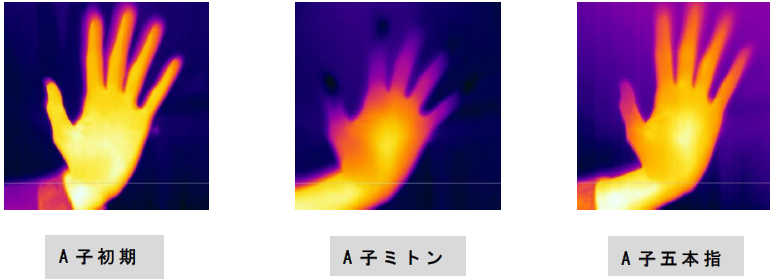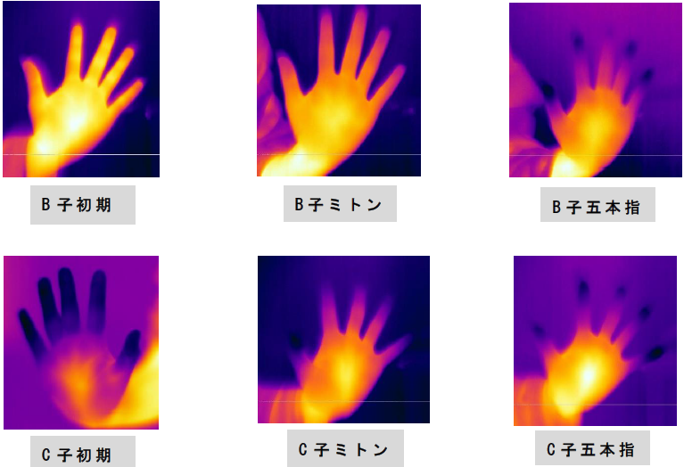 ・検証の際、中指の先端(最も外側にある)にセンサーを貼付したため、ミトンも 五本指も温度に差がでなかったのではないか?