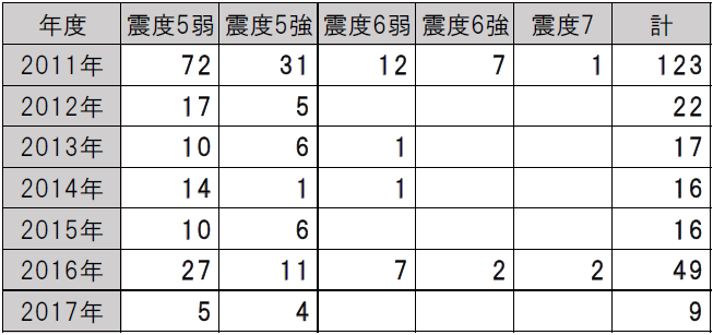 2017年度の気象集計が報告されています。その中で昨年の地震で震度 5弱以上を記録したのは 9回( 5弱 5回・5強 4回)となっています。ちなみに 2011年以降の 5弱以上の回数は
