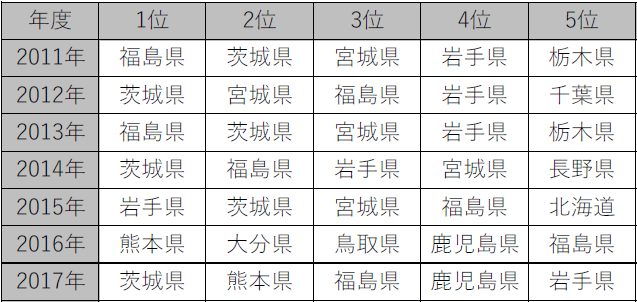 となっています。2011年の東日本大震災の余震が続いていることが、確認できる順位になっています。 2016年に熊本大地震があったので分布が九州地区に偏りましたが、東北地域も上位には入っています。