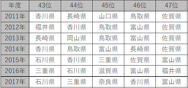 佐賀県や富山県などは地震の少ない集計になっていますが、あくまで短期間の集計で少ないだけで安心できるものではありません。現実に鳥取県は 2014年までは下位に位置していたのが 、2016年には第3位になっています。この期間だけの集計なので地震の多い少ないの判断には使えないものと思ってください。あくまでここ数年の傾向ということで紹介しておきます。