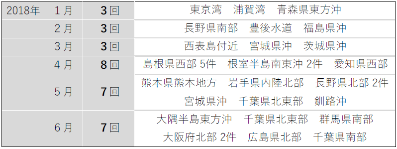 今年の 4月頃から震度 4以上の地震が多くなっているのは気にはなっていたのですが、大阪北部の地震の前日の 6月17日に群馬県南部で震度 5弱が、前々日の 16日には千葉県北東部で震度 4を観測していて、3日連続で震度 4以上を記録したことになりました。群馬県や大阪府は発生予測が低い地域だったので正直なところ驚いています。