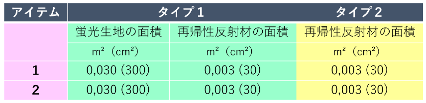 特徴的なのは、蛍光生地と再帰性反射材の両方を使用した明所・暗所対応のタイプ 1と暗所に重点を置いた再帰性反射材のみを使用した、タイプ 2の二通りの基準をかばん類の推奨規格と同様に設けています。