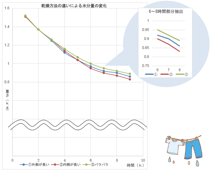 外側が長い(アーチ干し)が1番早く乾くと推測していたが、1番長く乾きにくいもの(今回の実験ではタオル)が吊るす場所に関係なく1番はやく乾いたため、内側が長い(V干し)が最も早く乾燥したと考えられる。今回の実験では、組成による差をなくすために、洗濯物はすべて綿100%に統一し、「長いもの=乾きにくいもの」として実験を行った。しかし、パイル地のタオルは表面積が多く、長さは1番長いがどの洗濯ものより早く乾いてしまった。そのため、推測とは異なる結果となったが、1番乾きにくいものを風が最もあたる外側にもってくると、全体の乾きが早くなるので良いという考え方は間違いではないと考えられる。