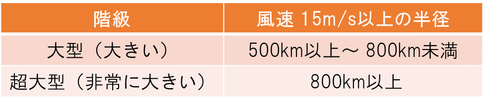 この日に超大型台風から大型台風になったとアナウンスされたのですが、そもそも大型と超大型の違いって・・・気になったので調べてみました。気象庁によると台風の勢力の目安は「大きさ」と「強さ」で表わすとあります。