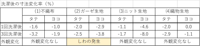 組成などを統一していないため参考程度の数値になりますが、今回使用した生地については以上の結果となりました。ガーゼ生地については、1回処理後からしわが発生し、外観変化がみられました。ガーゼ生地は洗うと縮んでしまうので、縫う前に一度水洗いをしてからアイロンをかけ、裁断することでしわを防ぐことができます。