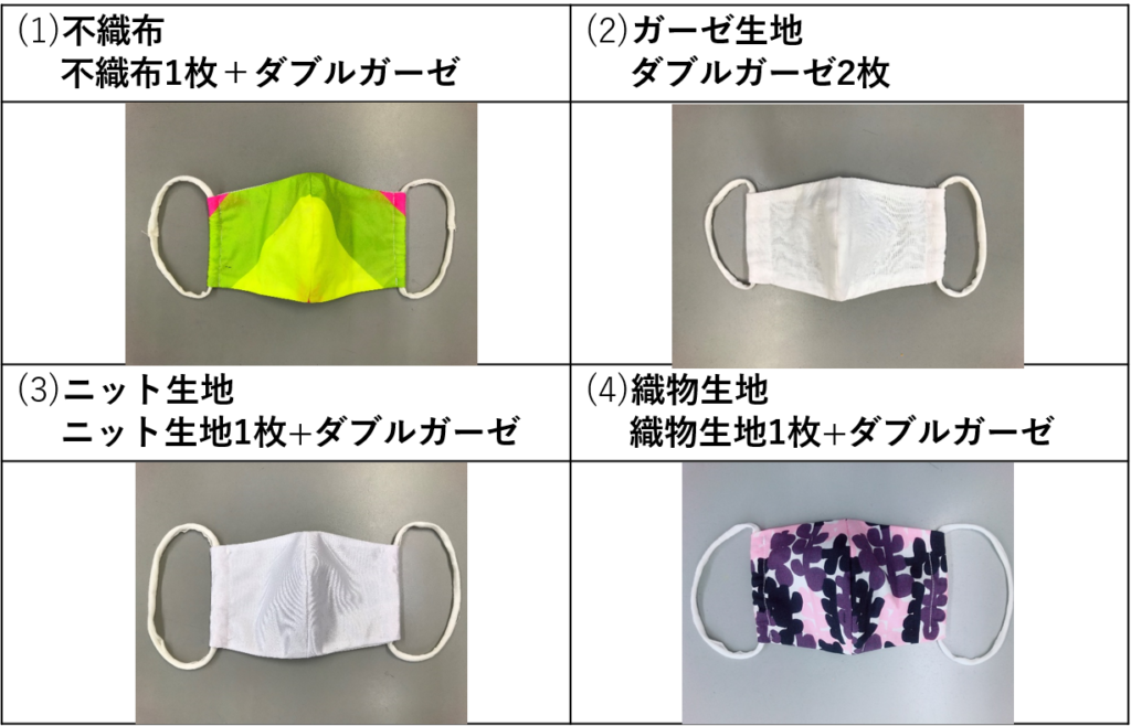 | 市販のマスク | ⑴不織布 | ⑵ガーゼ生地 | ⑶ニット生地 | ⑷織物生地 | |