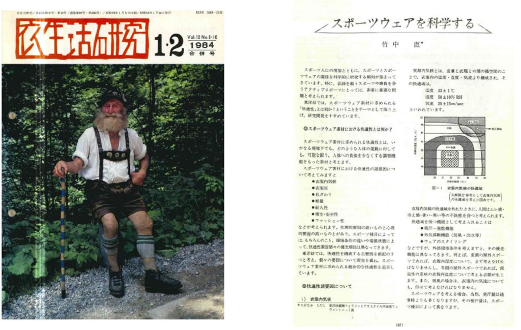 2013年10月に思いつきラボはスタートしているのですが 原稿の内容に質問やご意見も多くいただきました。その中で素材に関する快適性やスポーツ競技ウェアに求められる要素など 筆者が紡績会社時代にスポーツウェア向けのニット生地開発を担当していたこともあり問合せをいただくこともありました。今回 最終回となりますので筆者の37年前の原稿を紹介したいと思います。「衣生活研究」という本の1983年12月号と1984年1・2月合併号になります。