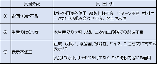 原因分類②は、生地メーカーで生地品質が本番で低下したり、縫製工場の本生産における縫製不良や規格不良などが原因として挙げられます。対策は、生地メーカーや縫製工場に対して、不良発生の未然防止策を具体的に文書化して提出していただくなどの対策が考えられます。
