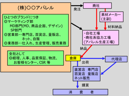 多くのアパレルメーカーは、複数のブランドを有し、ブランドごとにマーケティング部、営業部、業務部などがあります。自社工場や商社系協力工場(アパレル生産工場)で製造された商品は、アパレルメーカーが指定する外部倉庫に納品され、その後、代理店、専門店、百貨店、通販(ネット含む)などそれぞれの流通に出荷され、消費者の手にわたります。