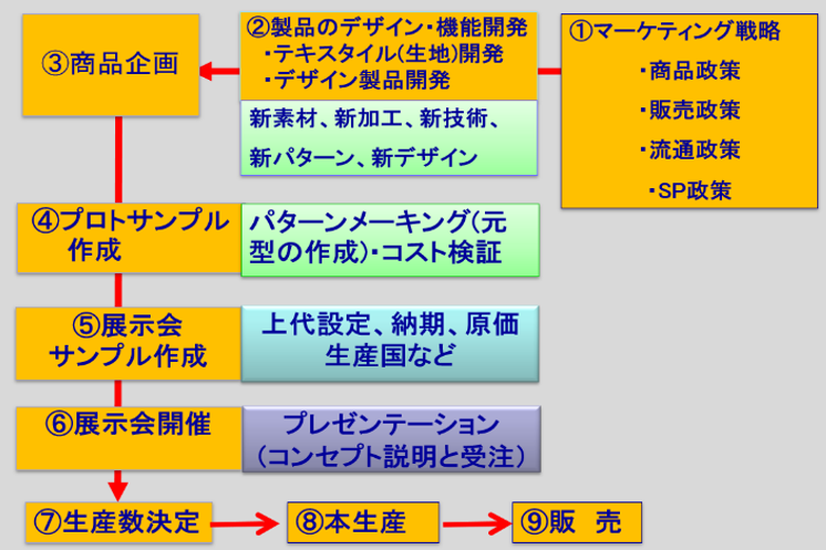 具体的にアパレルメーカーはどのようにモノつくりをしているでしょうか。2.1で示しましたように、モノつくりの基本はマーケットインであり、市場動向や消費者ニーズを把握することから出発します。図2は一般的なアパレルメーカーにおけるモノつくりの流れです。図の①から⑨へとものつくりが進行します。では、これから番号順にそれぞれの概要を説明しましょう。