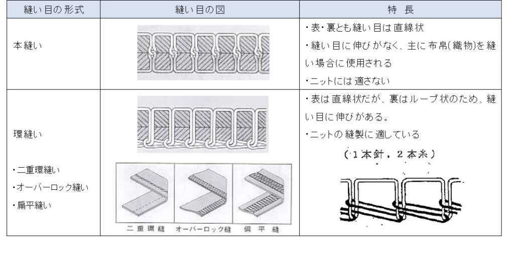 まずスラックスのシルエットですが、最近はスリムなデザインが流行していますね。このため縫い糸切れのリスクは高まっているといえます。着用中の縫い糸切れは、本生産で縫い糸張力の不適正や縫い糸間違いでも発生しますが、企画時の縫製仕様のミスマッチでも起こるので要注意です。どの程度生地が伸縮するかなど、素材特性をよく把握し縫製仕様を決定しなければなりません。特にストレッチ織物を縫製するとき、本縫いにするか、環縫いにするか、また伸び止めテープを併用するかなど、縫い仕様と縫い糸強度を考慮した仕様決定が望まれます。では、ここで、縫い目形式と縫い糸について、少し勉強しましょう。縫い目形式と特徴は表1の通りです。