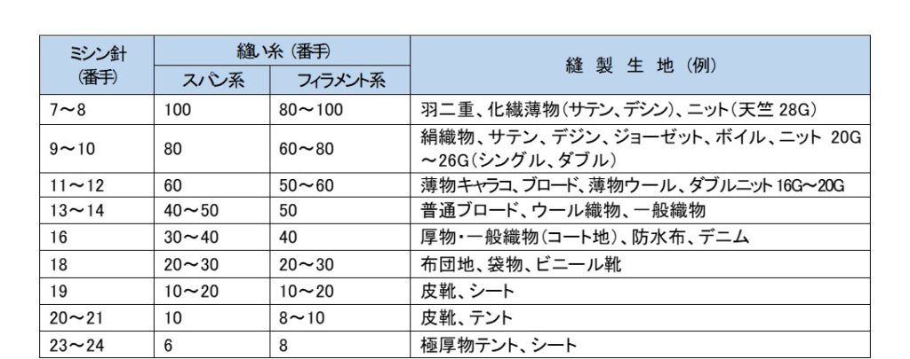 縫製する生地によって、ミシン針や縫い糸の太さは変わります。薄いジョーゼットのようなブラウスを縫製する場合は細い針と細い縫い糸を使用し、生地厚のデニムを縫う時は太い針と太い縫い糸を使用します。表2にミシン針・ミシン糸と縫製生地の関係を示しました。