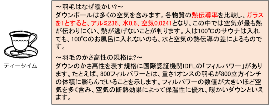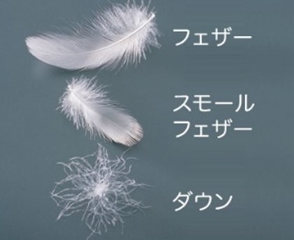 代表的なダウンジャケットを図4に示します。羽毛は水鳥(アヒルやガチョウ)の胸毛から採取された天然素材であり、図5のダウン(ボール)、フェザー、ファイバーで構成されます。ファイバーはこの写真にはありませんが、ダウンからちぎれた一本の繊維のことです。