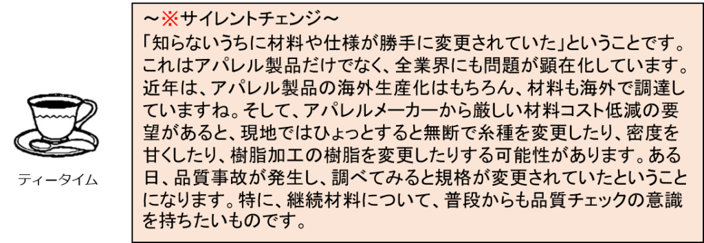 ・裏地などは、長年使用している継続生地が多い。長年使用している裏地でも、「※サイレントチェンジ」により知らないうちに規格が甘くなっていたり、加工方法が変更されている場合もあるので、継続素材も適時チェックされることをお勧めします。特に海外調達生地は要注意です。