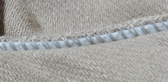 ・伸縮の大きい素材の場合、環縫いであっても、伸び止めテープなどを一緒に縫い込む。