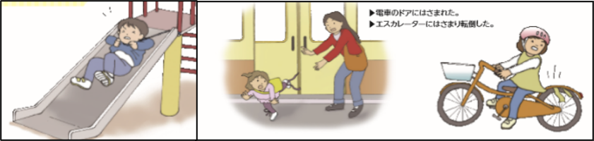 この項についても、昨年12月の第8回コラムP.5で紹介しましたね。子どもさんが着用していた衣料品に取り付けられていたひも、固定ループ、調整タブなどが、遊具や乗り物のドアに挟まれて、不測の事態が発生しないように仕様に配慮しなければならないものです。特に、背面、後頭部、パンツ裾など、視野に入りにくい部位のひも仕様には、万全の注意が必要です。ぜひ、読み返していただければと思います。