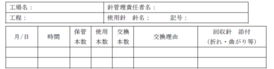 縫製工程では、「使用針管理台帳」などによる管理方法があります。「使用針管理台帳」は縫製工場内の各工程単位に、針の在庫数、針の定期交換や針折れ交換の実績などを記録するものです。作業中に針が折れた場合は、破片は見つかるまで捜すなど徹底した管理が求められます。