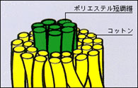 | 混紡糸 | 異種の繊維を混合して紡績した糸。繊維それぞれの弱点を補完する。 例) 綿・ポリエステル混紡では、綿の吸水性、ポリエステルの安定性 |