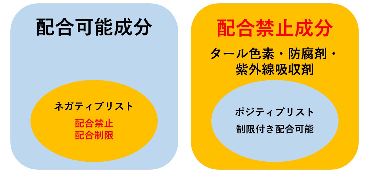表1のとおり、国によって安全性基準値に大きな違いがあることが分かります。日本での化粧品成分規制は厚生労働省の「化粧品基準」によって定められており、化粧品原料を規制することで安全性を担保しています。ネガティブリスト(配合禁止成分)とポジティブリスト(制限付き配合可能性分)を設定することで、企業の自由な原料配合を認めている一方、企業責任(製造販売業者)が問われるようになっています(図1参照)。