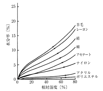 図1 各種繊維の等温吸湿曲線(25℃)1)