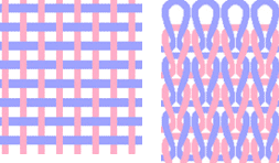 | 組織の特徴 | 経糸と緯が密に直交しているため、基本的にはたて・よこ方向に伸びにくい。バイアス方向は若干伸びる。構成糸の自由度は低い(伸縮糸使いはこの限りではない) | 連続するループのつながりで組織が形成されるため、たて・よこ方向の伸びは大きい。構成糸の自由度は大きい(ニットの中でも、経編は伸びが少なく、織物の性能に近い 傾向あり) |