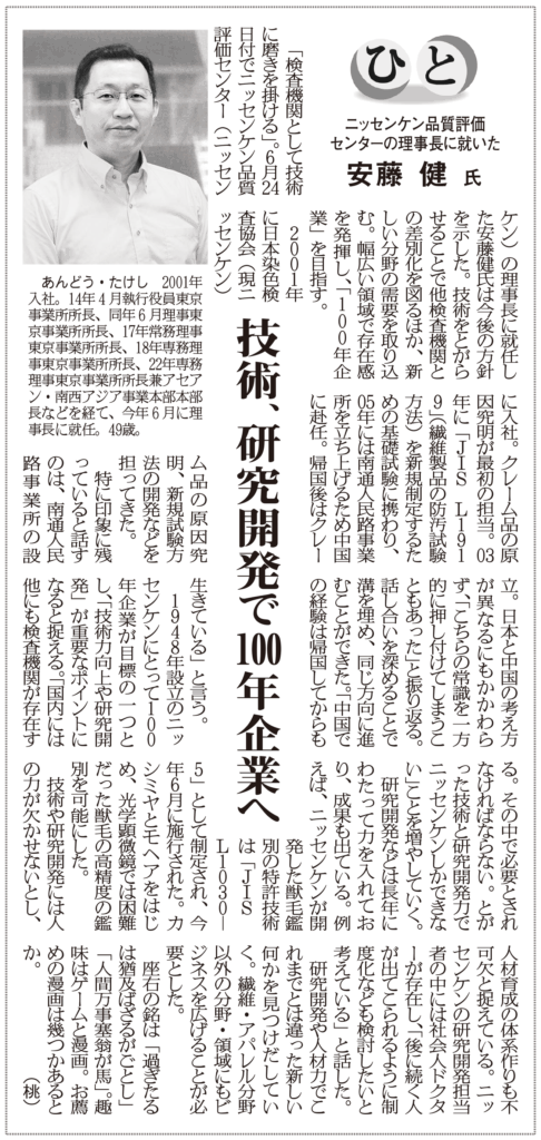 繊研新聞社Web 2023.7.6(THU) / 【トップインタビュー】エコテックス®強みに変化対応力をさらに磨く