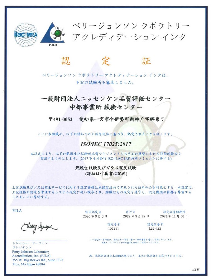 一般財団法人ニッセンケン品質評価センター(以下、ニッセンケン)は、中部事業所における自動車、農業用及び林業用のトラクタ及び機械装置の車室内に用いる材料に対する「燃焼性試験」で【ISO/IEC 17025】 の認定を更新、加えて自動車内装材の「ガラス霞度試験」の認定を新規取得いたしました。