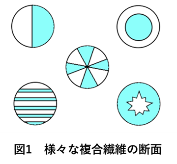 その名の通り、複数のポリマーを合わせて作られる繊維のことです。性質の異なる 2種類以上のポリマーを、紡糸口金から同時に押し出し複合・紡糸することで、複数の特徴を併せ持った繊維を作ることが可能です。