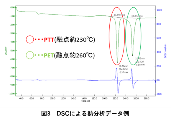DSCの導入により、複合繊維(ポリエステル)のような2種類のポリエステルも融点の違いに基づく鑑別が可能となります。