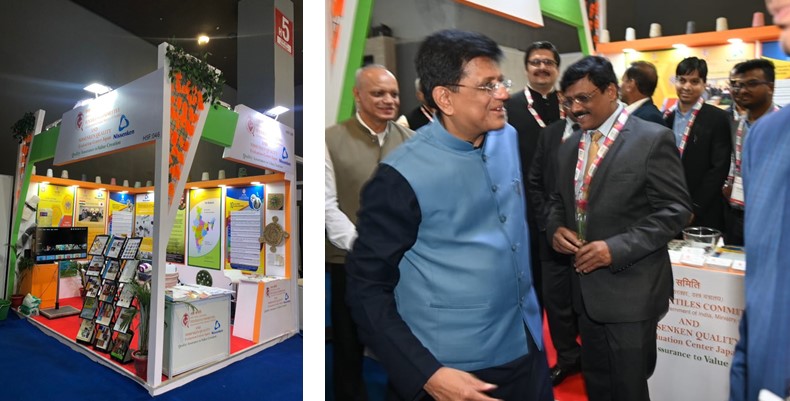 ニッセンケンはインド繊維省テキスタイルコミティ(TC)と共同でブースを構えました。これまでもモディ首相が提唱する「Make in India」を、品質管理面から促進させるため、政府系機関TCと協力して進めており、今回のコラボレーションブースもその一環となります。TCニッセンケン共同ブースには日本企業はもちろんのこと、現地のインド企業や欧米企業なども多数お立ち寄りいただき、日本のお客様に還元できる様々な情報を新たに入手することができました。さらにゴヤル繊維省大臣も当ブースに来訪いただき、TCとニッセンケンの取り組みについて熱心に聴かれ、さらなる発展を期待するお言葉をいただきました。