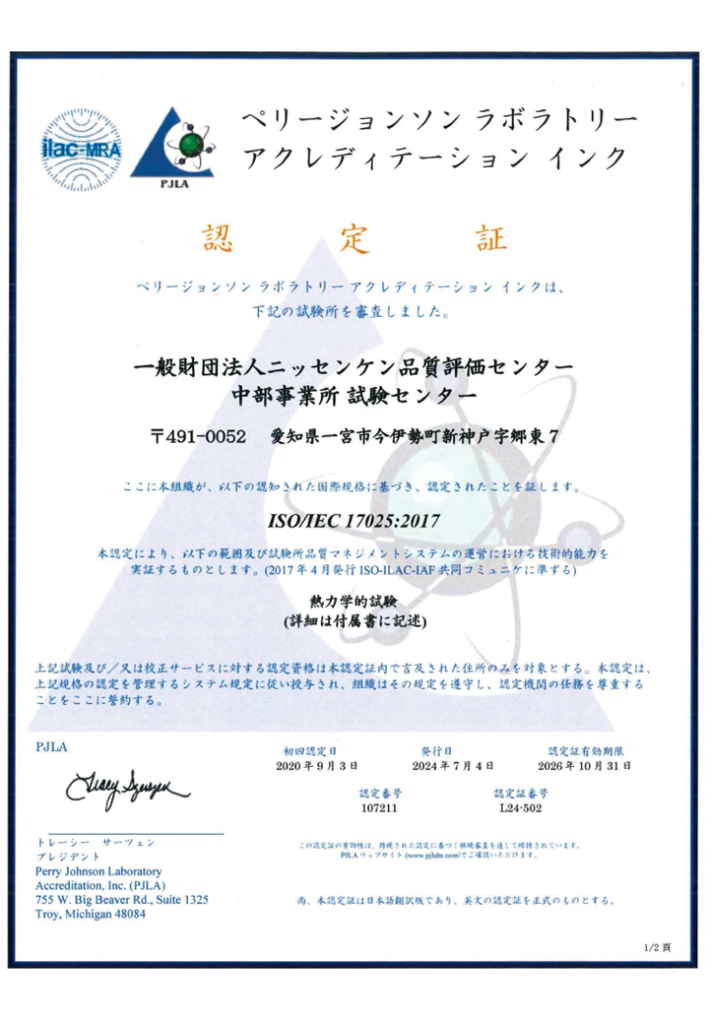 一般財団法人ニッセンケン品質評価センター(以下、ニッセンケン)・中部事業所はこのたび、車両関連の「燃焼性試験」及び「自動車内装材のガラス霞度試験」で、従来の【ISO/IEC 17025】認定を更新するとともに、試験範囲の認定拡大として、新たに米国連邦自動車安全基準(FMVSS)に基づく燃焼性試験:FMVSS 302についても取得しましたのでお知らせします。