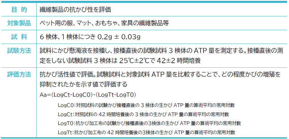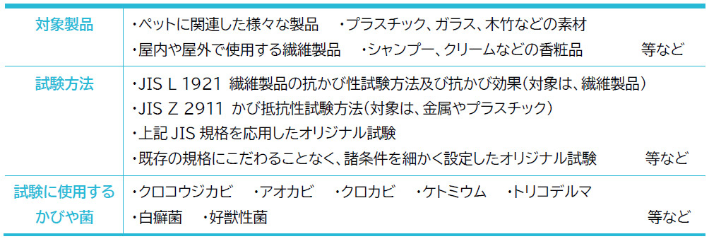 今回ご案内した、好獣性菌を利用してペット用繊維製品の抗かび効果を評価することだけではなく、ペットに関連した様々な製品、プラスチック、ガラス、木竹、また屋内や屋外で使用する繊維製品や、シャンプー、クリームなどの香粧品も試験対象です。JIS Z 2911 や他の規格に従ってカビ抵抗性の評価を実施しています。下表はその一例となります。