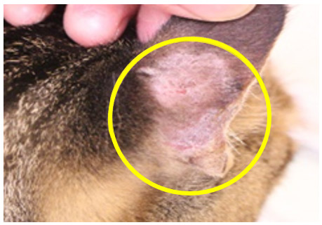 Microsporum canis は動物における真菌症の原因菌(好獣性菌)であり、日常生活の中に存在します。特にまだ幼かったり、高齢だったり、環境の要因で免疫力が低下してしまった犬・猫は感染しやすい傾向にあります。皮膚糸状菌に感染した場合、毛や皮膚の表面に発症します(右写真=猫の耳部、引用:なんよう動物病院 ウェブサイト)。